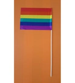 Esta bandera del Orgullo Gay se encuentra disponible en nuestro catálogo en medida de 60×40 centímetros. La bandera de tela va grapada a un palo e madera de 120 centímetros.