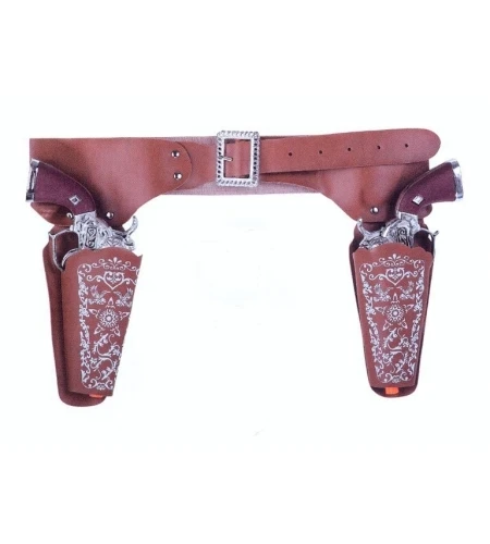 El producto contiene cartuchera doble decorada con detalles y cinturón para sujetar a la cintura. También incluye dos pistolas tipo revolver de plástico.