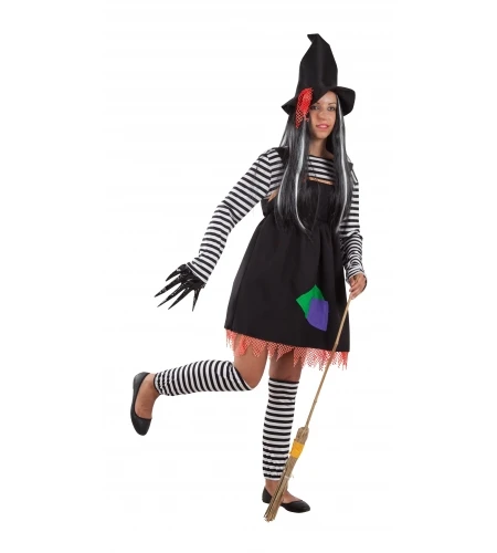 El disfraz de bruja rayas blanco y negro se encuentra disponible para adulto en tallas 42 y 48.