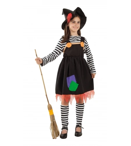 Atraerás todas las miradas con este colorido y simpático disfraz de bruja para niña.