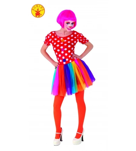 Colorido disfraz de payasita para adulto. Talla única. Contiene vestido con falda, tutú y nariz.