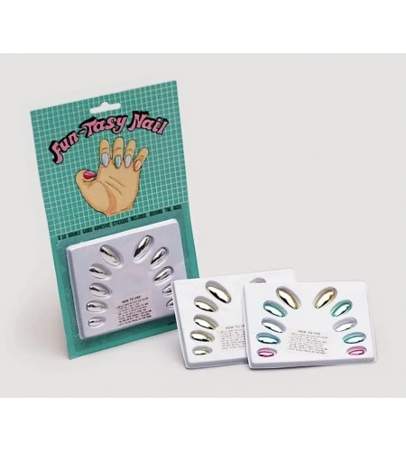 BLISTER CON 10 UNAS QUE SE FIJAN CON UN ADHESIVO. DISPONIBLES EN ORO, PLATA Y MULTICOLOR.