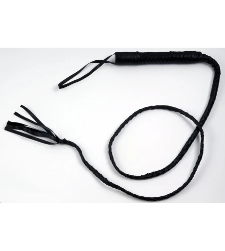 El complemento látigo largo está fabricado en cuero trenzado de color negro.