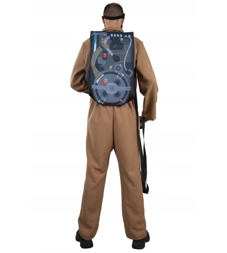 El traje contiene el mono completo con mochila y pistola. Asimismo, se encuentra disponible en tallas 42, 48 y 52 para adulto y está fabricado en material de tela. El mono es de color marrón, como se muestra en las imágenes, con el identificativo de los auténticos Cazafantamas en el lateral de una manga.