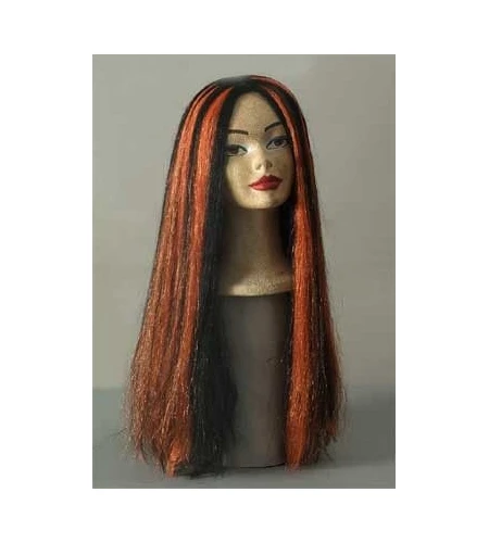 PELUCA HALLOWEEN MELENA LARGA REALIZADA EN PELO SINTETICO COLOR NEGRO Y MECHAS NARANJA.