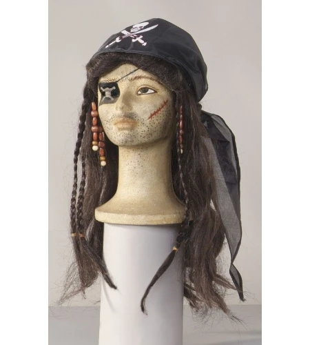 LA PELUCA PIRATA CON PAÑUELO ESTA FABRICADA EN PELO SINTETICO Y ADORNADA CON ABALORIOS.