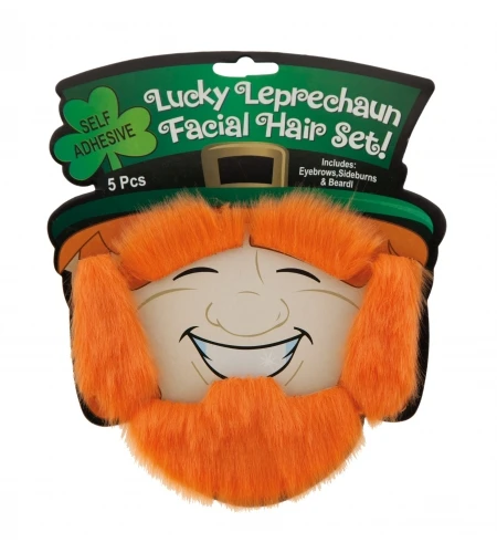 Set irlandes fabricado con fibras sintéticas, incluye barba, cejas y patillas, sujeción mediante cinta adhesiva.
