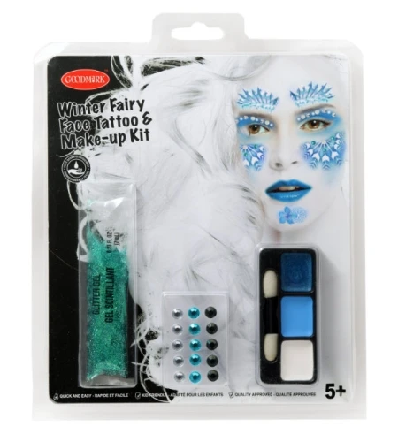 Este set maquillaje de princesa del invierno incluye: una hoja con tatuajes, 7ml de brillo azul en gel, 15 gemas adhesivas, un aplicador con doble punta y 3 colores de maquillaje graso de 1 gramo (azul oscuro, azul claro y blanco).