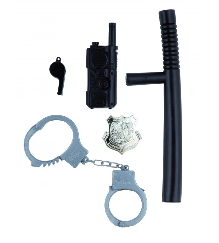 SET POLICÍA FABRICADO EN PLÁSTICO. INCLUYE CASCO, ESPOSAS ,PORRA, WALKI, PLACA Y PITO.