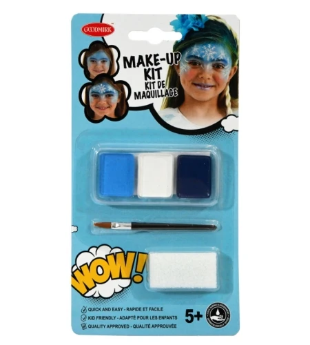 Este set de maquillaje de princesa de las nieves contiene: 3 tarrinas de 2 gramos en colores blanco, azul y azul oscuro.