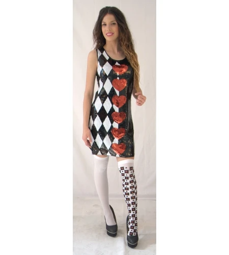 Este colorido y económico vestido de lentejuelas con diseño de rombos y corazones se encuentra disponible en diferentes tallas y será un brillante modelito para tu próxima fiesta de disfraces.